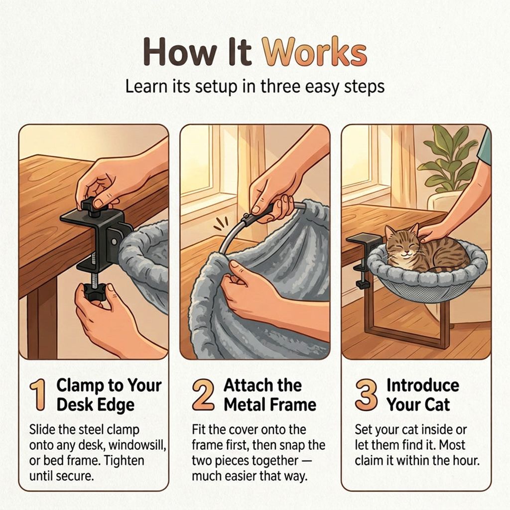 - 🐾 Space-Saving Design – Attaches directly to your desk, no bulky cat trees needed.