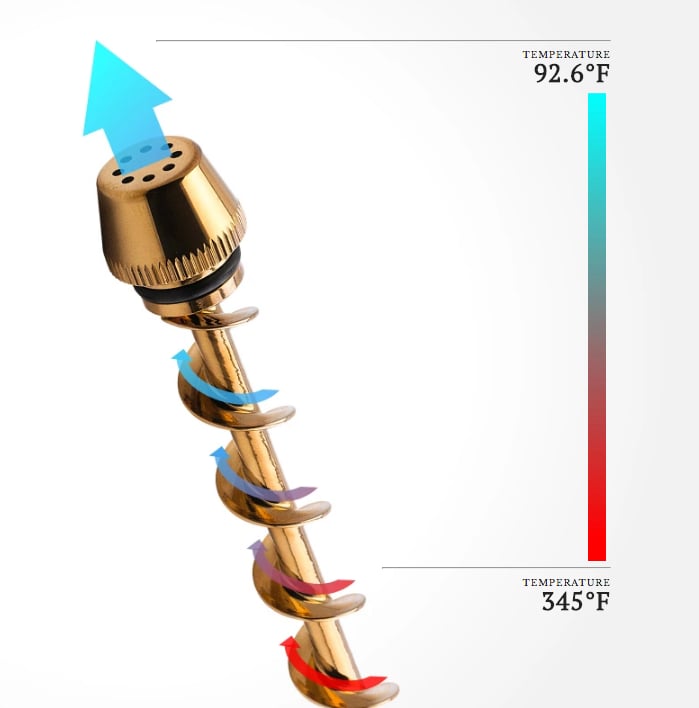 The screw cools down smoke by doubling the length of the smoke path, giving the augur more time to absorb heat. The heat sink and path lengthening properties of the screw contribute to a 30% cooler hit.