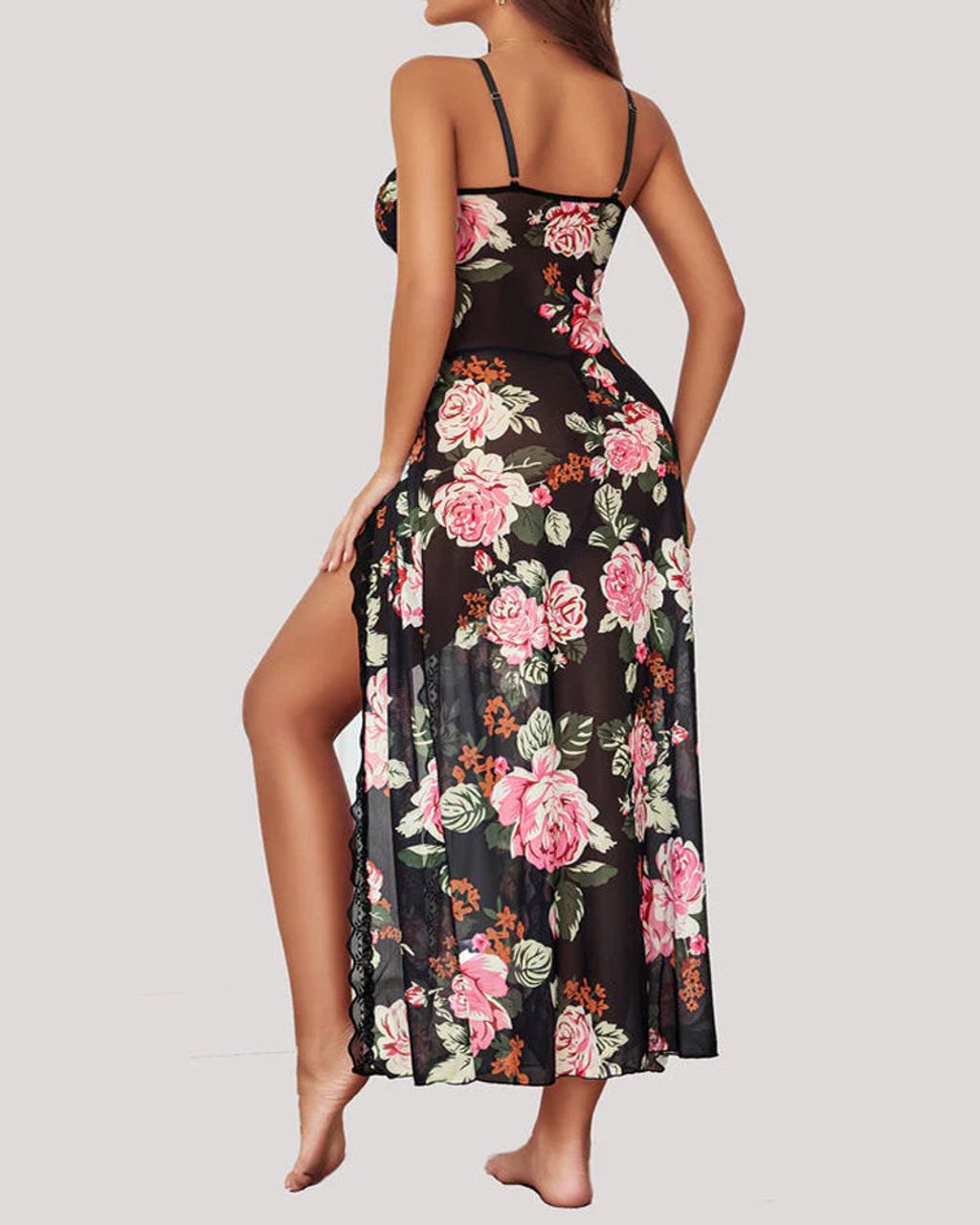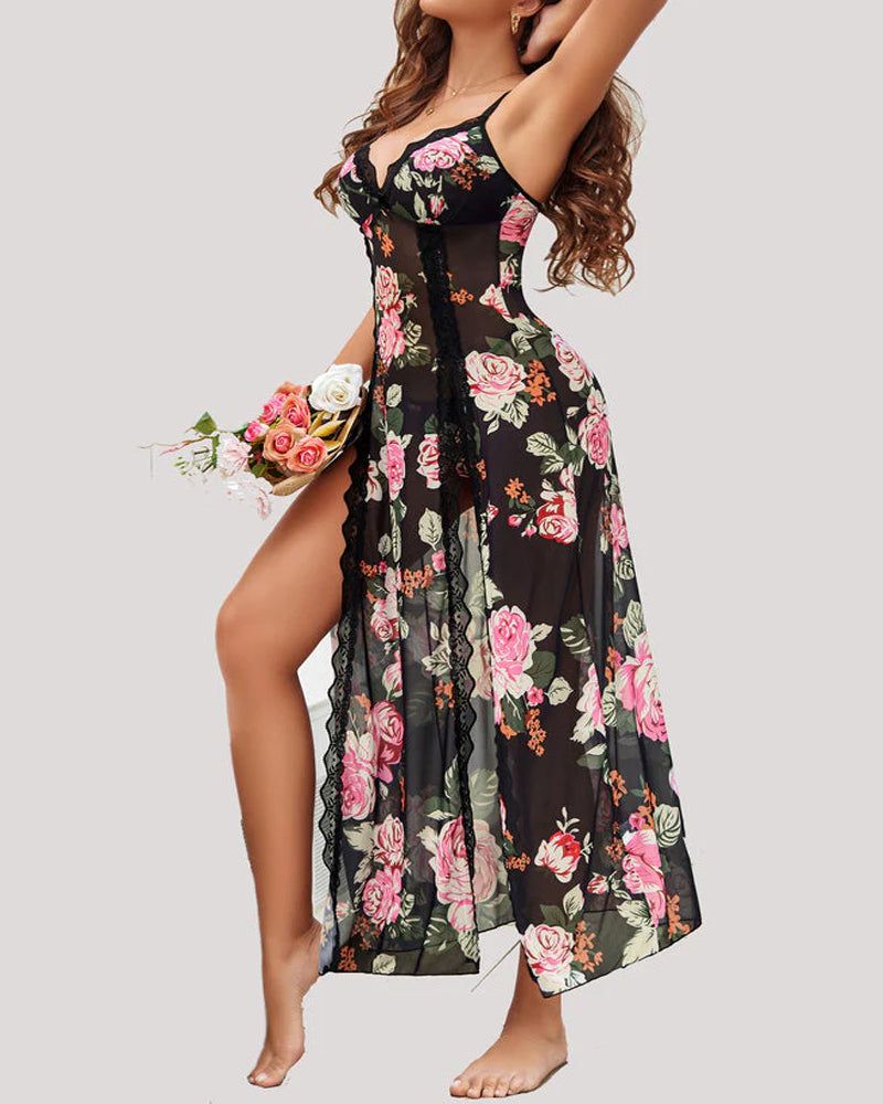 Sexy Suspenders See-Through Lace Mesh Long Slits Pajamas
