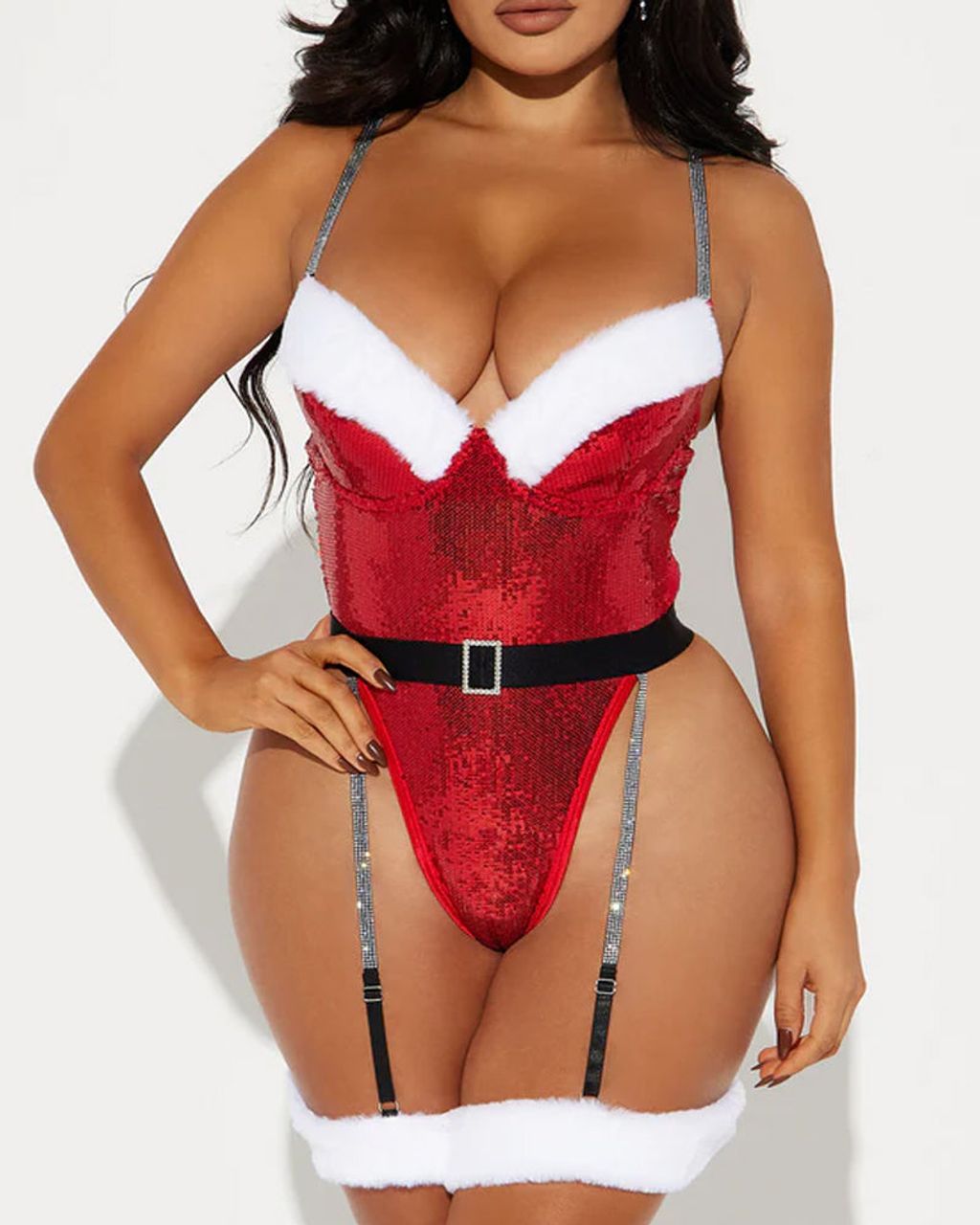 On Santa’s list this year? Step into a lustrous one-piece that marries festive charm with bold appeal. A sequinned “Naughty List” detail brings a wink of fun, and the soft stretch fabric glides over the body, creating a sleek, party-perfect silhouette.