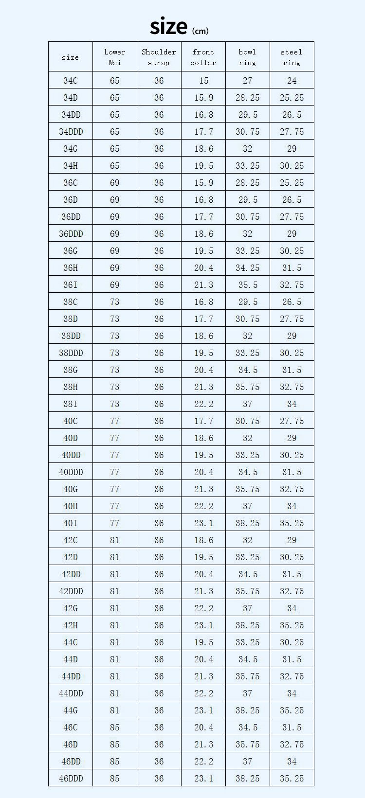 - Cup Size: If you are unsure about your cup size, the difference between your bust and band measurement will help determine it (refer to the size chart for guidance).