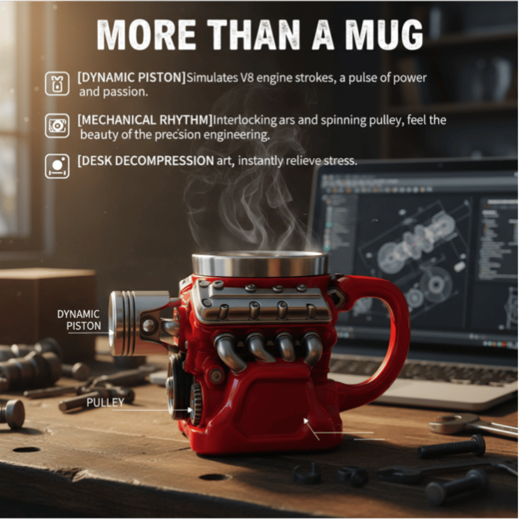 【Attractive Look】: Crafted with intricate V8 engine motifs, this Retro Engine Coffee Mug boasts a truly creative and eye-catching design that car enthusiasts will appreciate for its realistic charm to power and precision