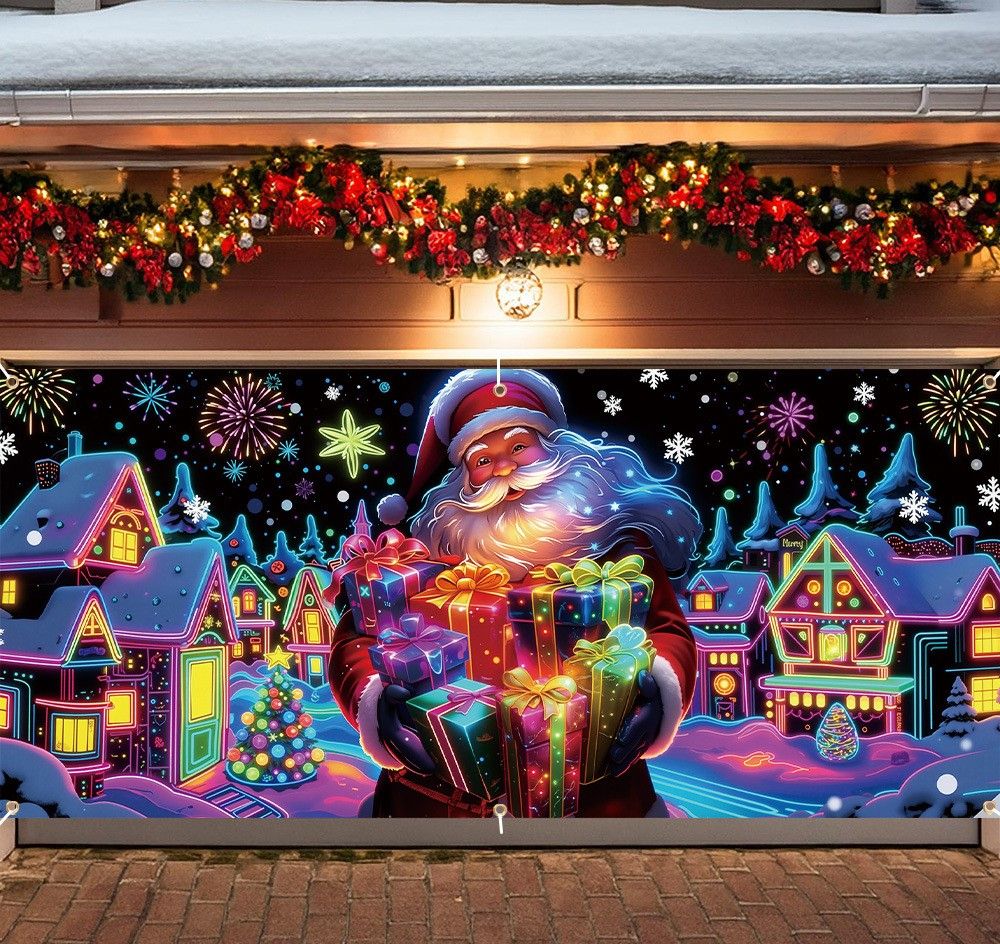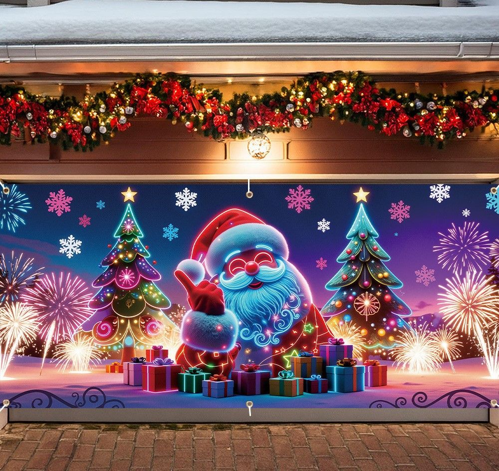 Every detail bursts with festive spirit. Featuring Santa, playful elves, and bright ornaments, this banner captures the heart of Christmas and instantly fills the air with happiness. It’s the kind of decoration that makes everyone smile the moment they see it, turning your garage into a storybook scene of holiday cheer.
