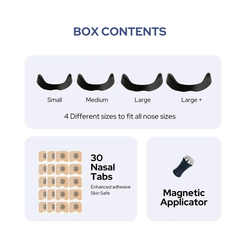 ✅ Easy-to-Use Nose Strip Kit with Magnetic Applicator: Each kit includes 4 reusable bands (various sizes), 15 or 30 single-use nose strips, and a convenient magnetic applicator for fast, secure placement. Perfect for beginners and experienced users of nasal strips for breathing or anti snoring nose clips.