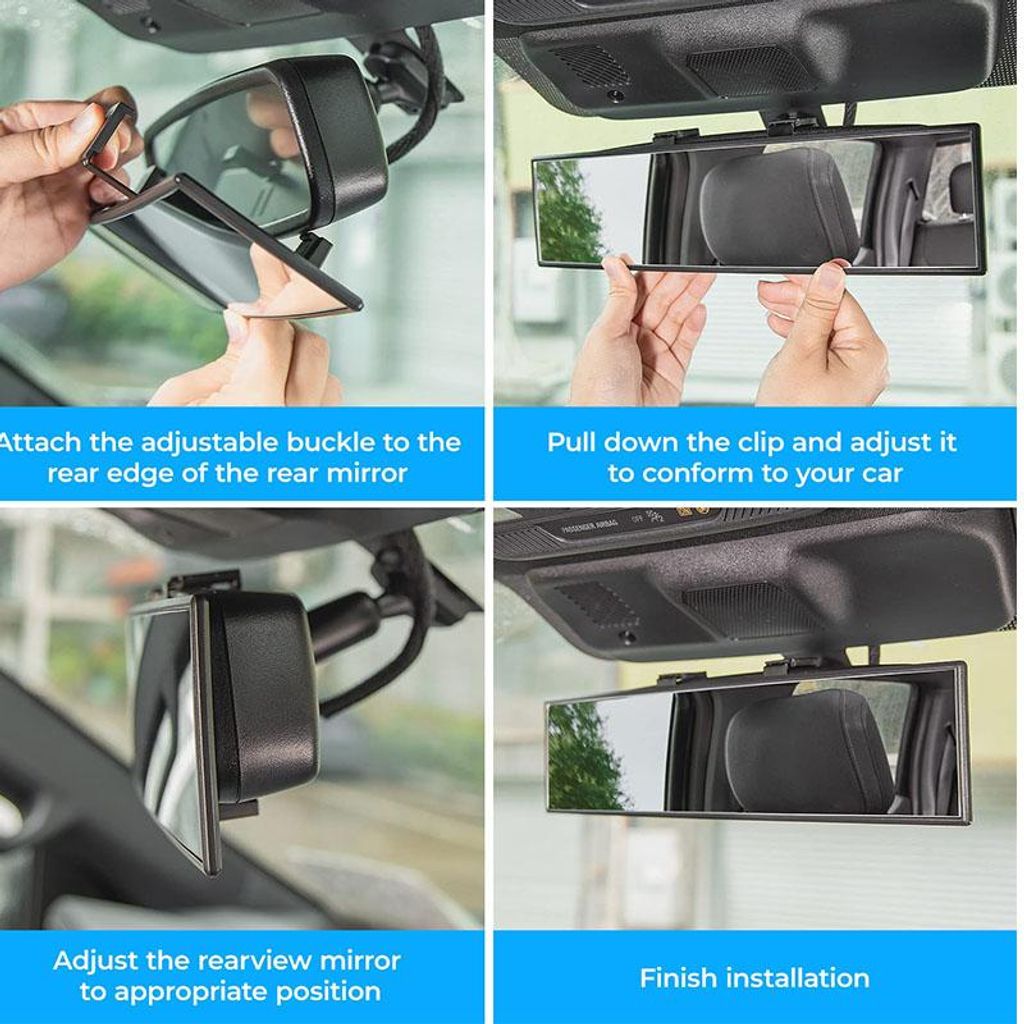 The mirror installs in 10 seconds onto the original interior mirror using two adjustable buckles, no tools required.
