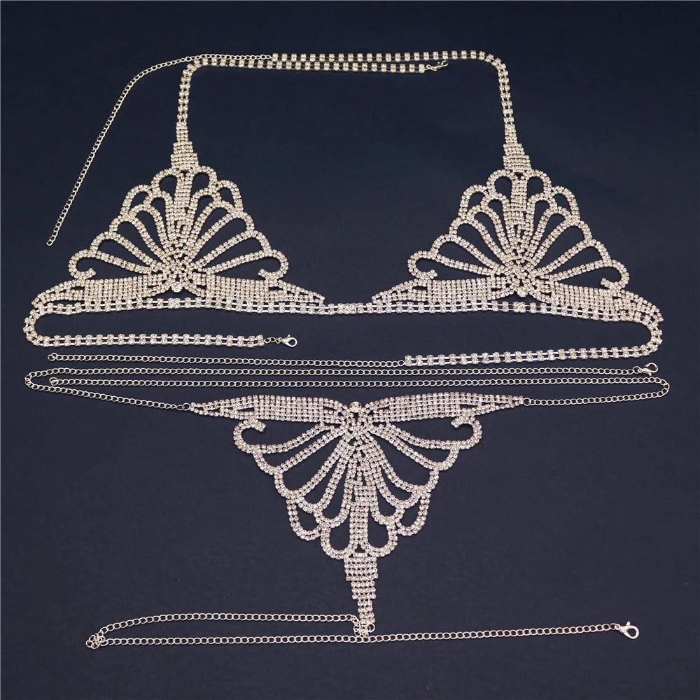 Turn up the glam with a set that’s as dazzling as you are. This masterpiece features rhinestones that catch the light with every move, paired with delicate chain details for an ultra-seductive edge. Designed to make you shine, shimmer, and steal the show—because nothing should sparkle more than you.