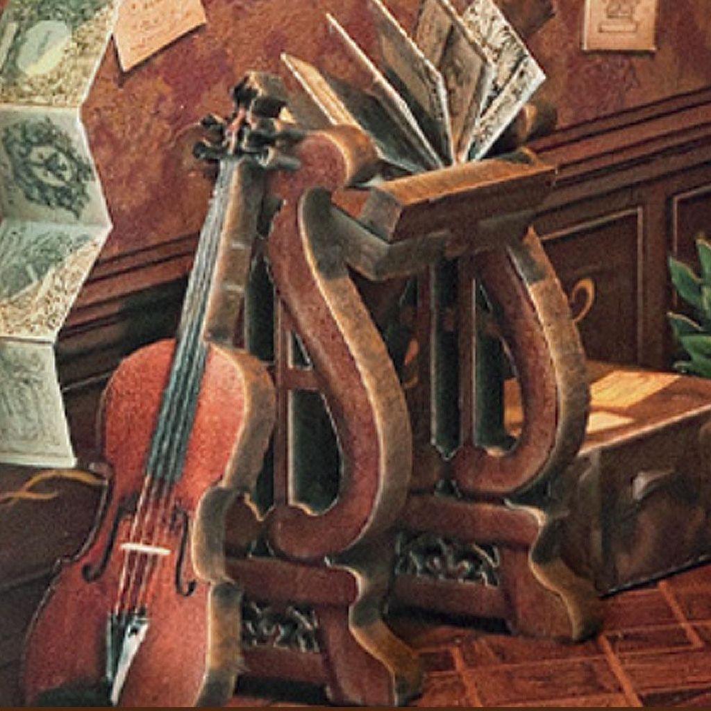 Explore the exquisite miniature furnishings that fill this charming space. You'll find a quaint wooden desk adorned with tiny flipped books, inviting you to imagine stories untold. Leaning elegantly against the wall is a miniature violin, adding a touch of artistic flair.