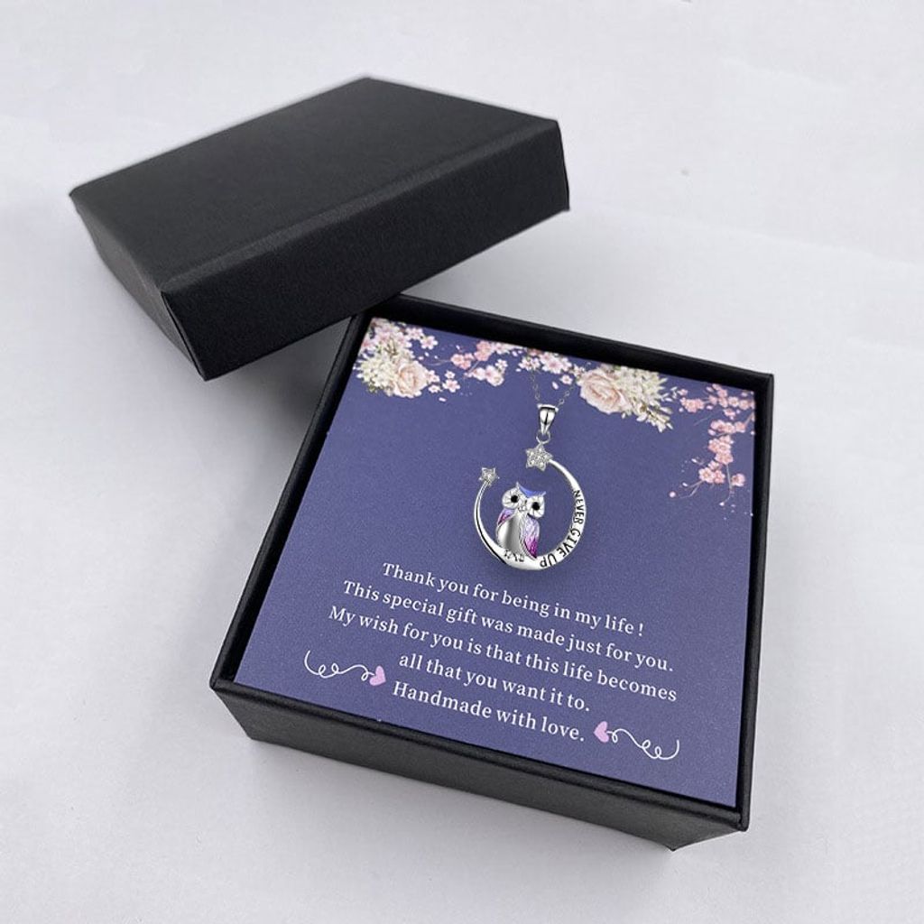 - 1×Owl Necklace Moon Star Necklace + Gift box + Card