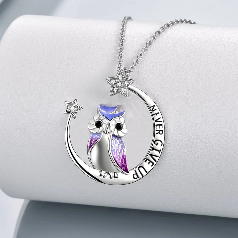 - 🦉 The Meaning: The owl Necklace engraved the word " Never Give Up "is the symbol of wisdom, bravery and nobleness, freedoms, secrets, dreams, magic, darkness, silence, seeing things that are hidden, and shape-shifting.