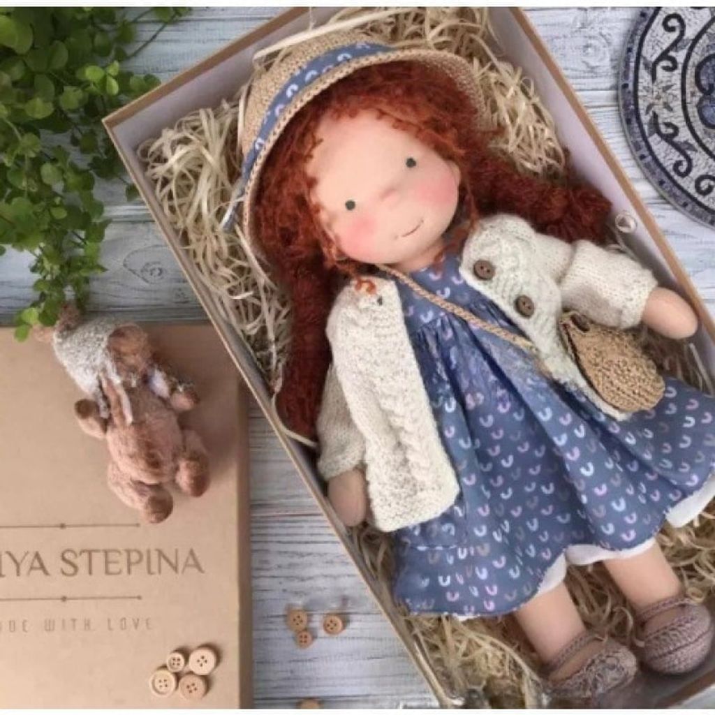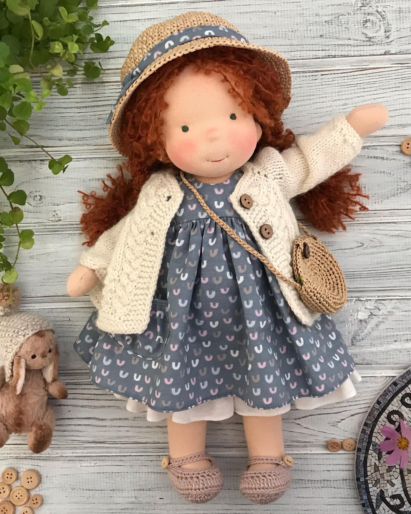 Soft and cuddle doll is made in Knitted style with 100% organic cotton (De witte engel) and stuffed very firmly with natural fiber - clean organic wool Wollknoll.